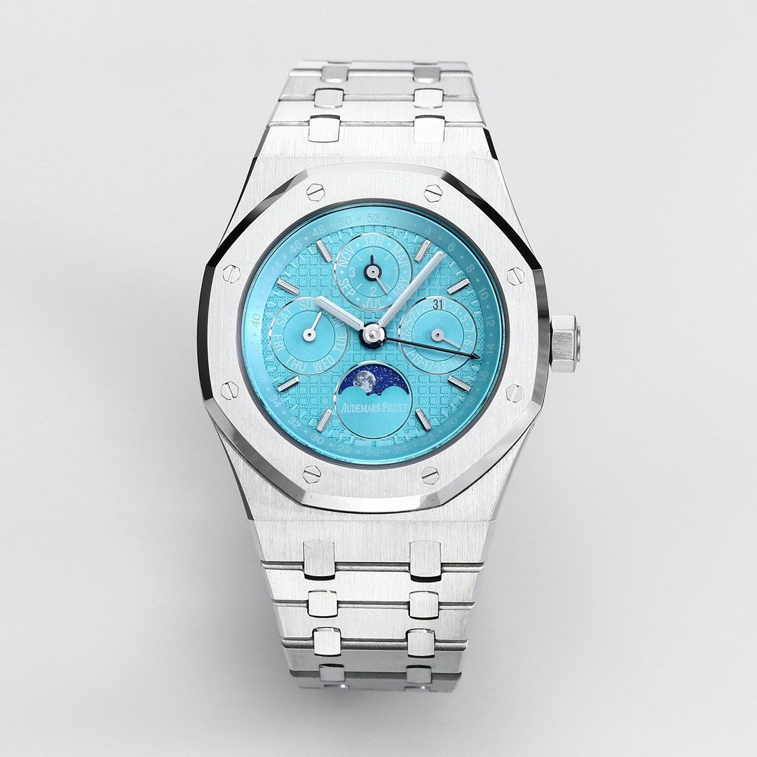 Discover the breathtaking BBR Royal Oak Series—an unrivaled complex perpetual calendar watch, model number 26574ST.OO.1220ST.03. This watch is not just a timepiece; it embodies sophistication and innovation. Designed for discerning individuals, its noble aesthetic and elegant blue plate perfectly reflect high technology woven into a classic design. The stainless steel case, with a thickness of just 11.4mm and a diameter of 41mm, ensures durability while exuding a sleek, modern look.