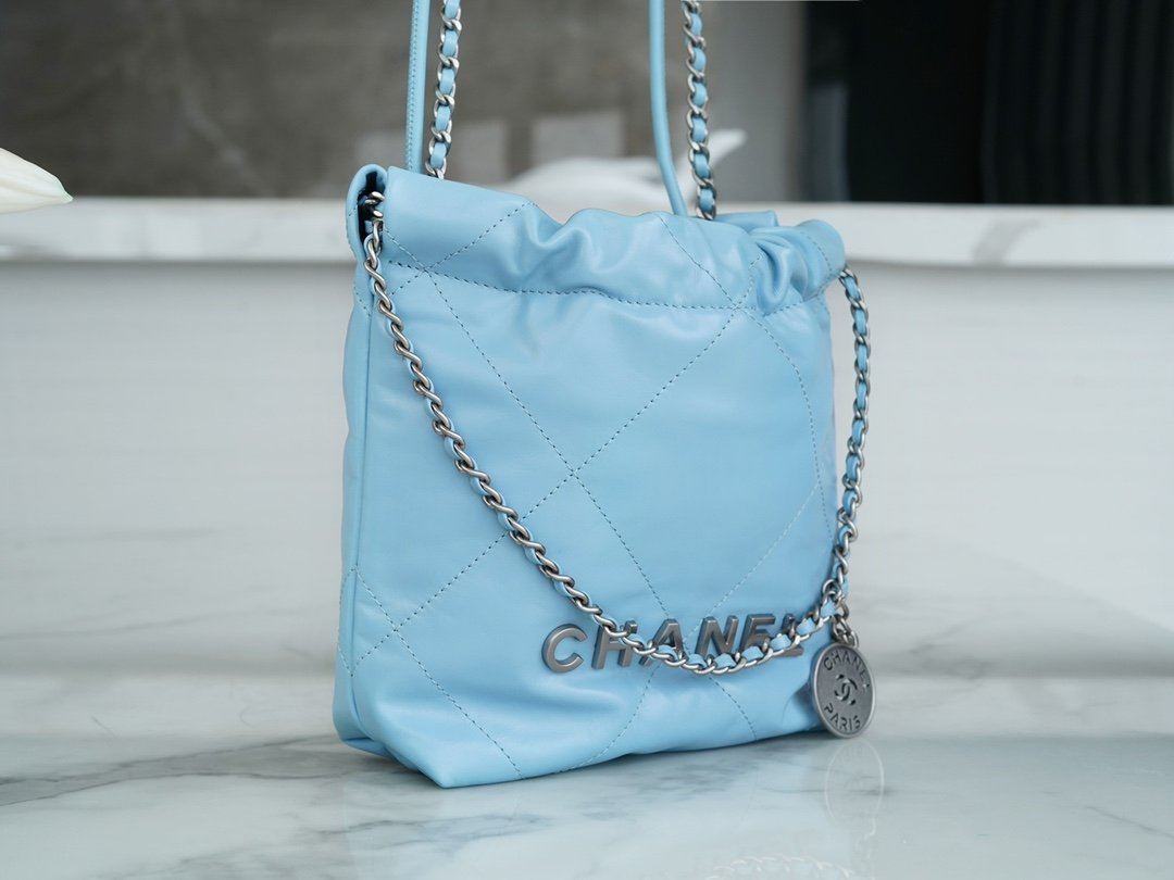 The Chanel 23A 22Mini bag is a perfect blend of sophistication and fun. Crafted in a stunning light blue shade and featuring a sleek silver buckle, this compact bag is designed to elevate any outfit and make a bold statement. Its playful charm is complemented by its practicality, making it the ideal accessory for any occasion.