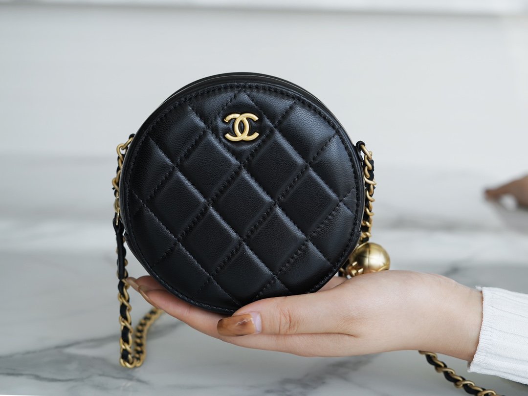 Introducing the Chanel Metal Ball Series Small Round Cake in Black, an accessory that beautifully fuses sophistication with practicality. Designed for the modern woman, this bag embodies the essence of simplicity and elegance, making it a must-have for any wardrobe. Whether you’re heading to the office or going out for a casual meet-up, this bag complements your style perfectly.