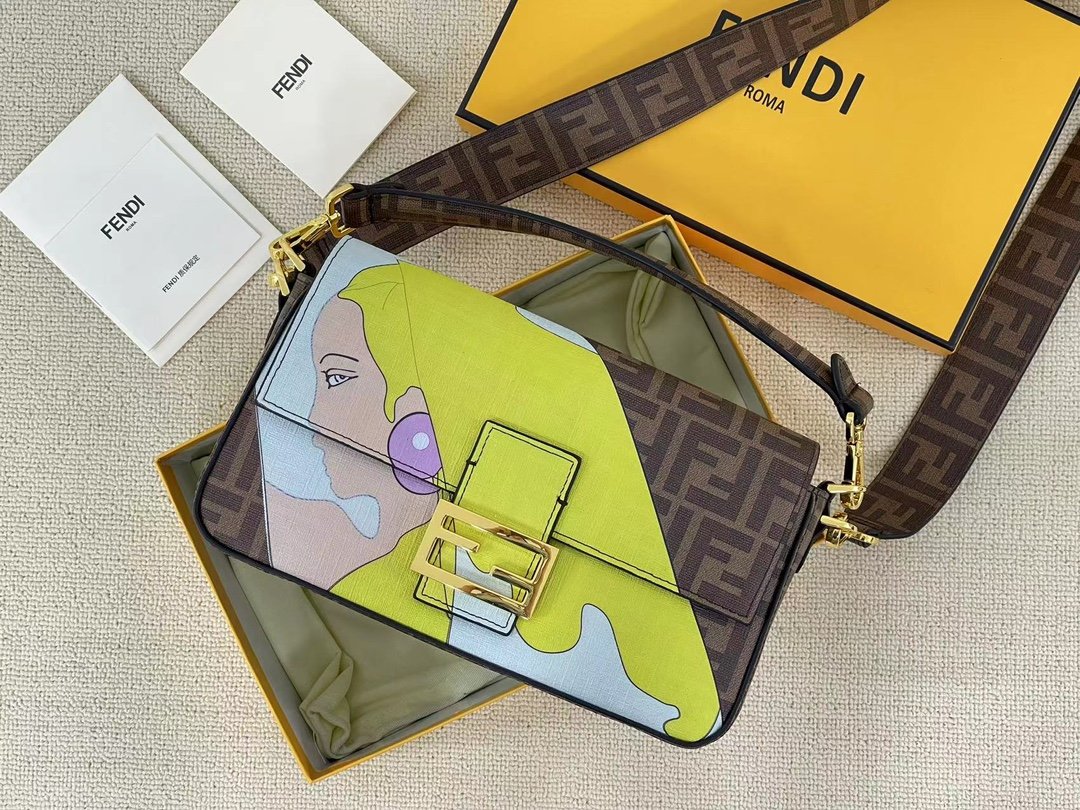 Introducing the upgraded full package batch 2022 Fendi BagBaguette, a magnificent creation that incorporates the latest artist fashion illustrations. Originally launched in 1997, the BagBaguette remains a timeless and trendy accessory celebrated by fashion enthusiasts around the globe. This highly versatile bag is designed to be carried with ease and style; it can be worn as a shoulder bag or cross-body, catering to all your styling needs.