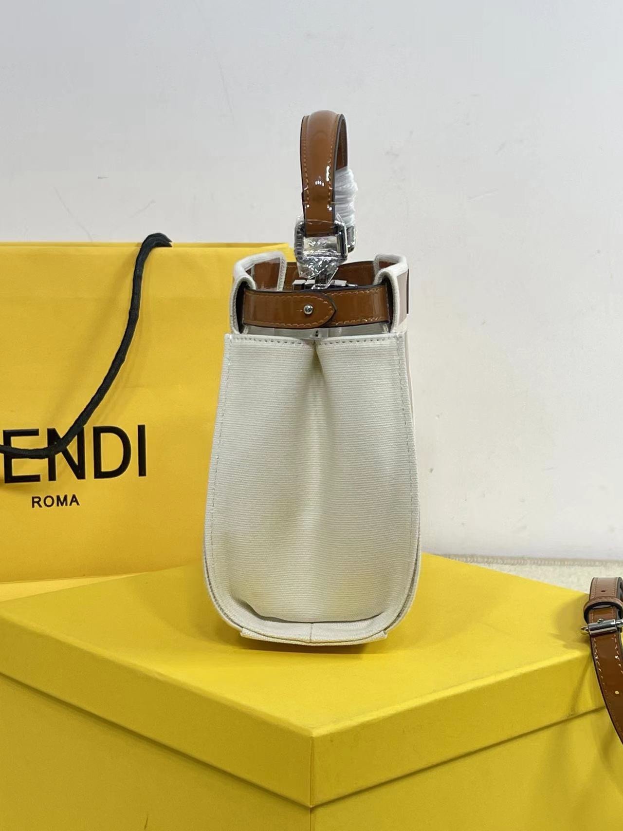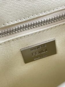 The Peekaboo’s iconic twist locks, elegantly positioned on both sides, not only enhance its visual appeal but also ensure the security of your belongings. Inside, you’ll find a thoughtfully designed interior. The two compartments are separated by sturdy hard partitions, providing excellent organization. A practical internal zipper bag offers additional space for smaller items, while the silver-finished metal pieces add a touch of refined glamour. The attention to detail is unparalleled, reflecting FENDI’s commitment to exceptional craftsmanship.