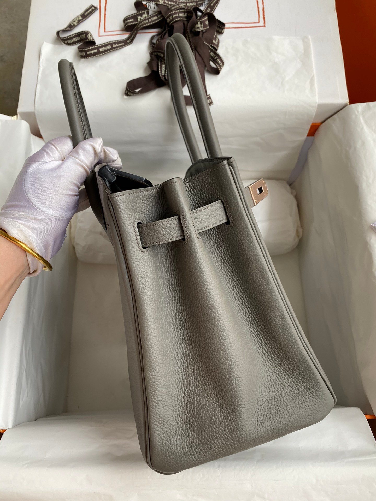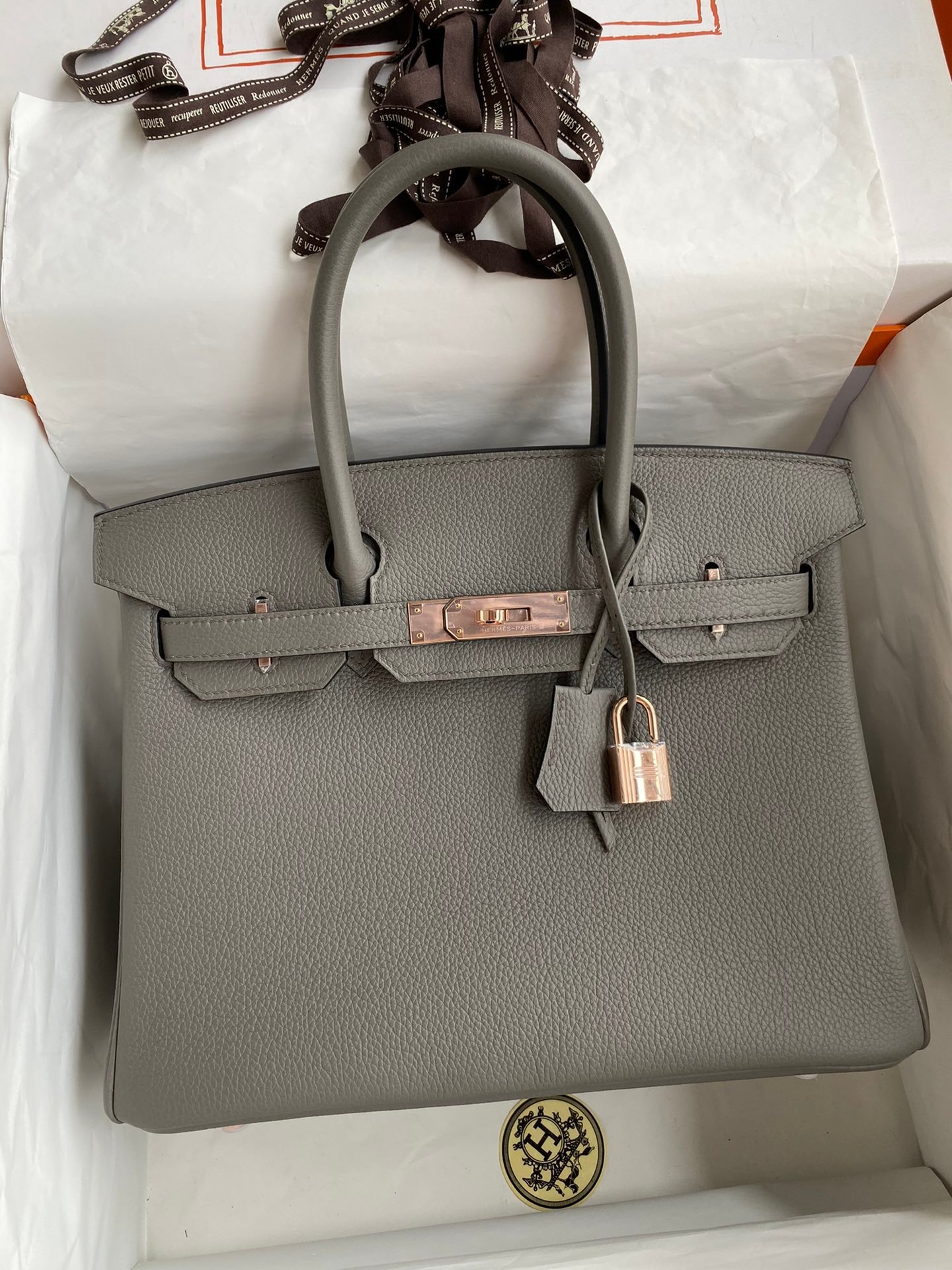 The Hermes Birkin 30cm is not just a handbag; it is a statement piece that showcases exclusivity and elegance. The luxurious royal calfskin leather exudes a soft yet durable quality, ensuring that your investment withstands the test of time. The elegant rose gold buckle adds a touch of sophistication and contrasts beautifully with the tin grey leather, creating a unique color palette that stands out in any setting.