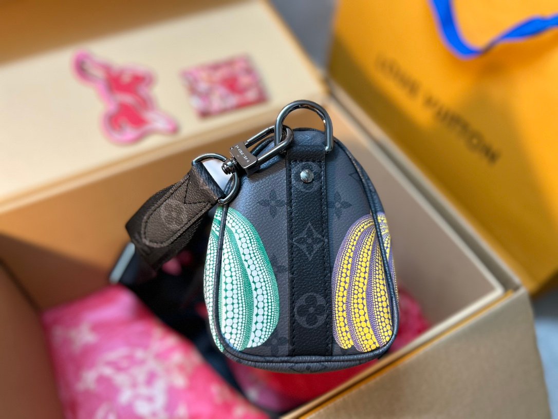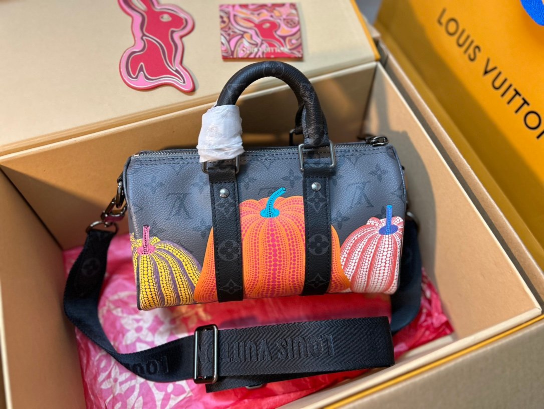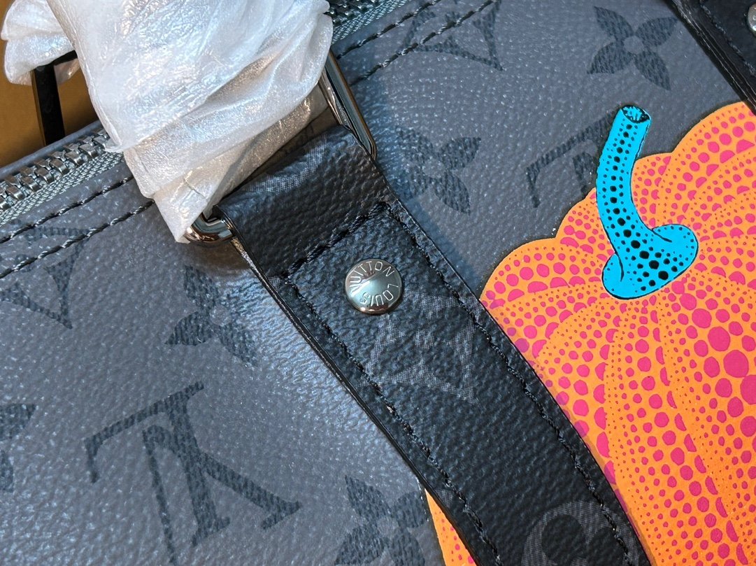 One of the standout features of this handbag is the detachable pumpkin-shaped decoration, a nod to Yayoi Kusama’s signature style, acting as a visual business card of the artist. This unique accent not only adds a touch of whimsy but also continues the hallmark elements of the Keepall series. The zipper opening ensures that your personal belongings remain secure, allowing you to carry your essentials with peace of mind.