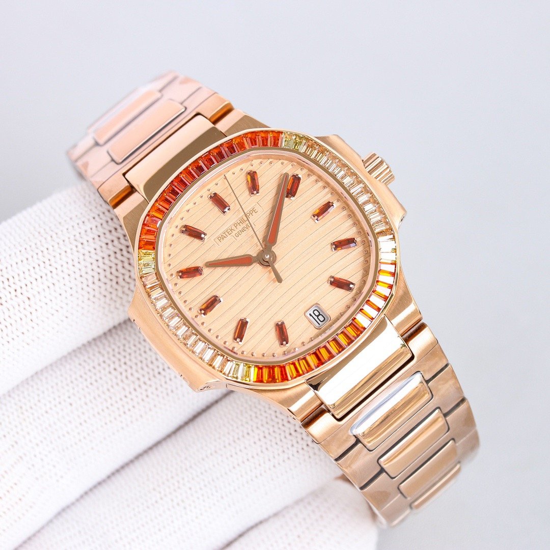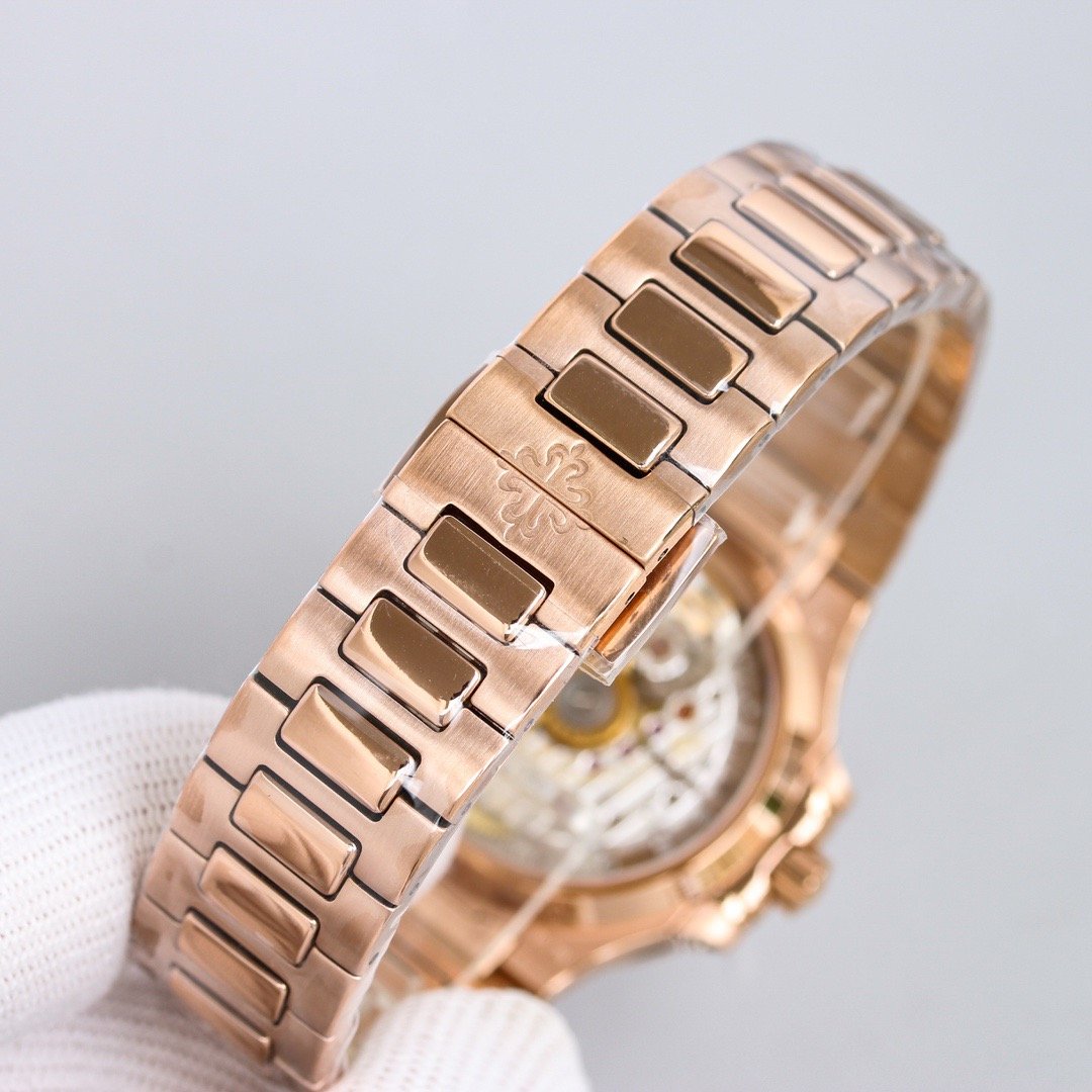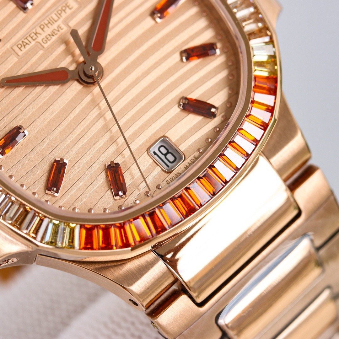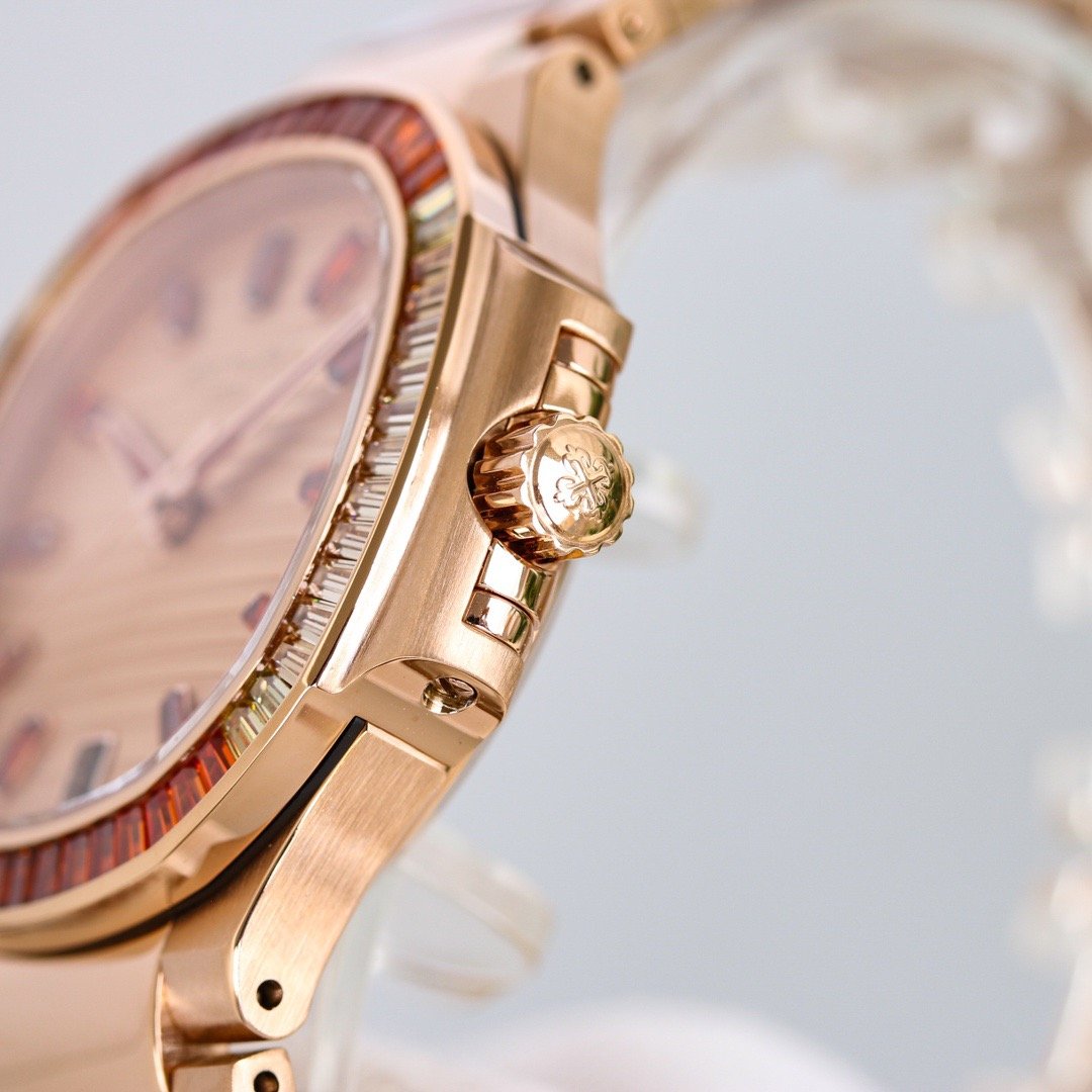 The Nautilus 7014 is powered by a robust customized 9015 to 324 S all-in-one winding mechanical movement. The heart of the watch beats in perfect harmony, featuring a large center second hand that glides with precision. The watch face, adorned with T square diamonds, offers both style and functionality, showcasing a 6-character display calendar window that reflects an impeccable attention to detail.