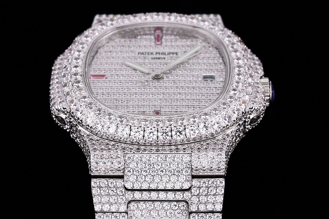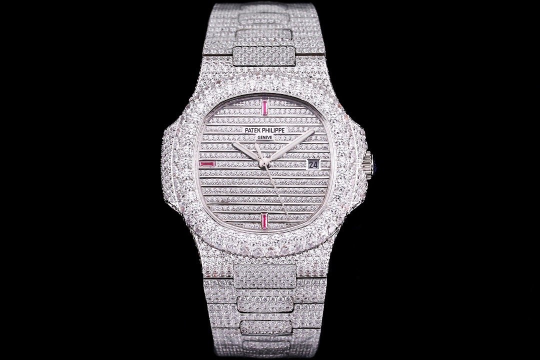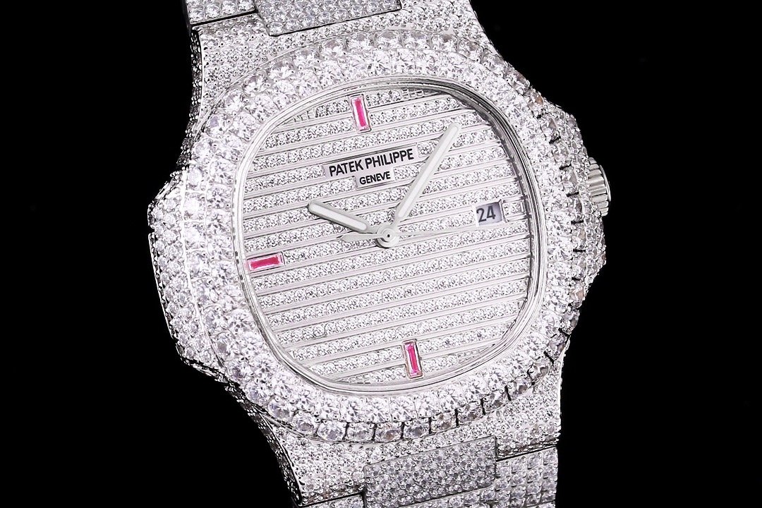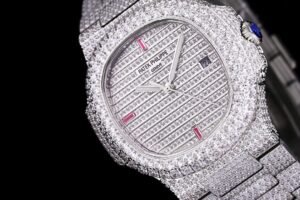 At the heart of the Patek Philippe Nautilus 5711 is the imported original Cal.324 automatic mechanical movement, ensuring accuracy and reliability. With a diameter of 40×11.5mm, this luxury watch offers a well-proportioned presence on the wrist. Its striking case is fashioned from 18K white gold plated with shimmering Swarovski diamonds, making each timepiece uniquely captivating. The sapphire double-sided crystal mirror not only provides stunning clarity but also protects the watch from scratches, ensuring that its beauty endures for years to come.